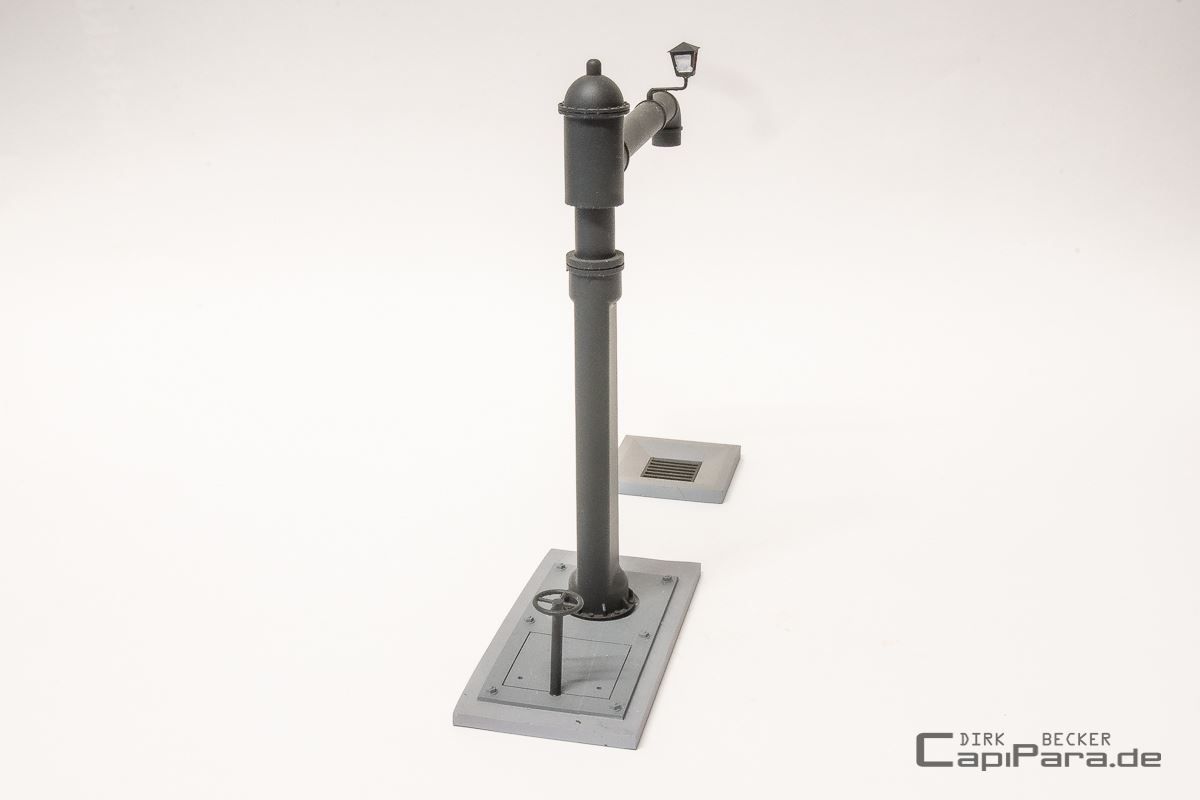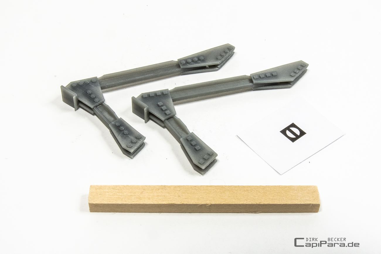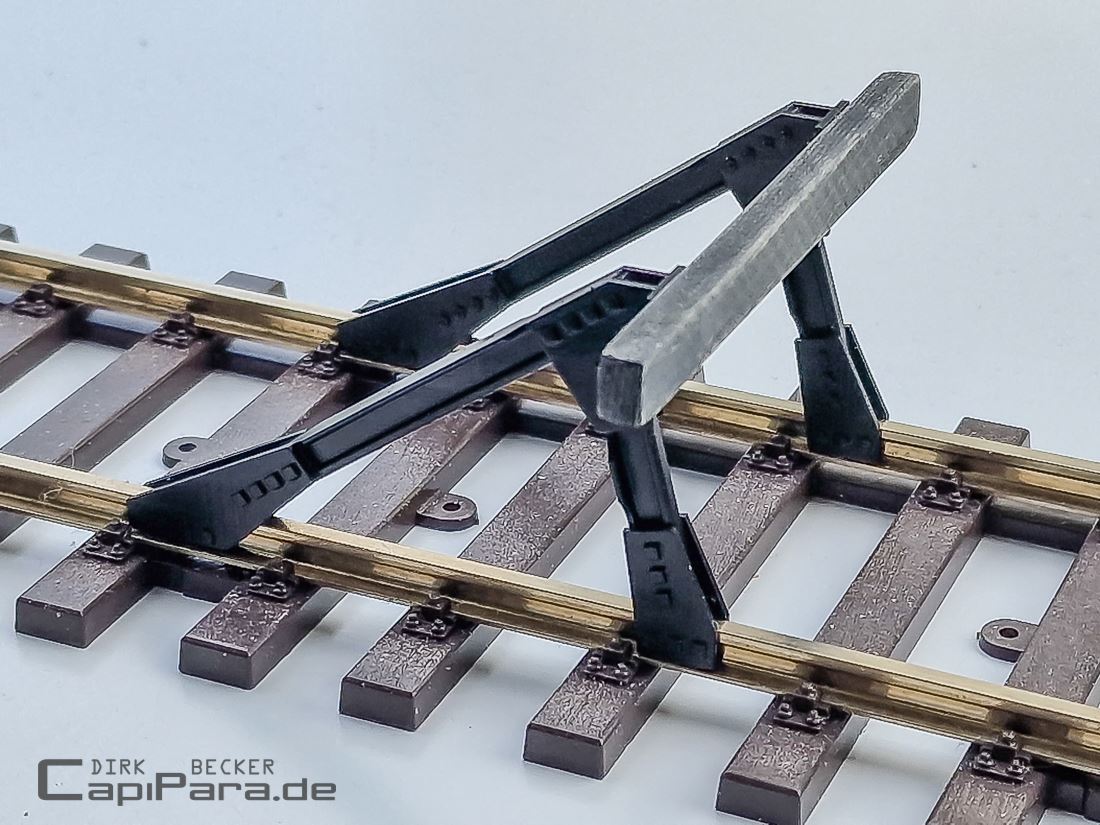 An der Außenseite vom Prellbock sind die Verschraubungen als Vierkantkopf, auf der Innenseite als Muttern dargestellt. Die Teile können an jeder beliebigen Stelle auf das Schienenprofil eingeklipst werden, passt für Gleise von Hübner/Märklin, KM1, WENZ und auch bei HOSENTRÄGER.