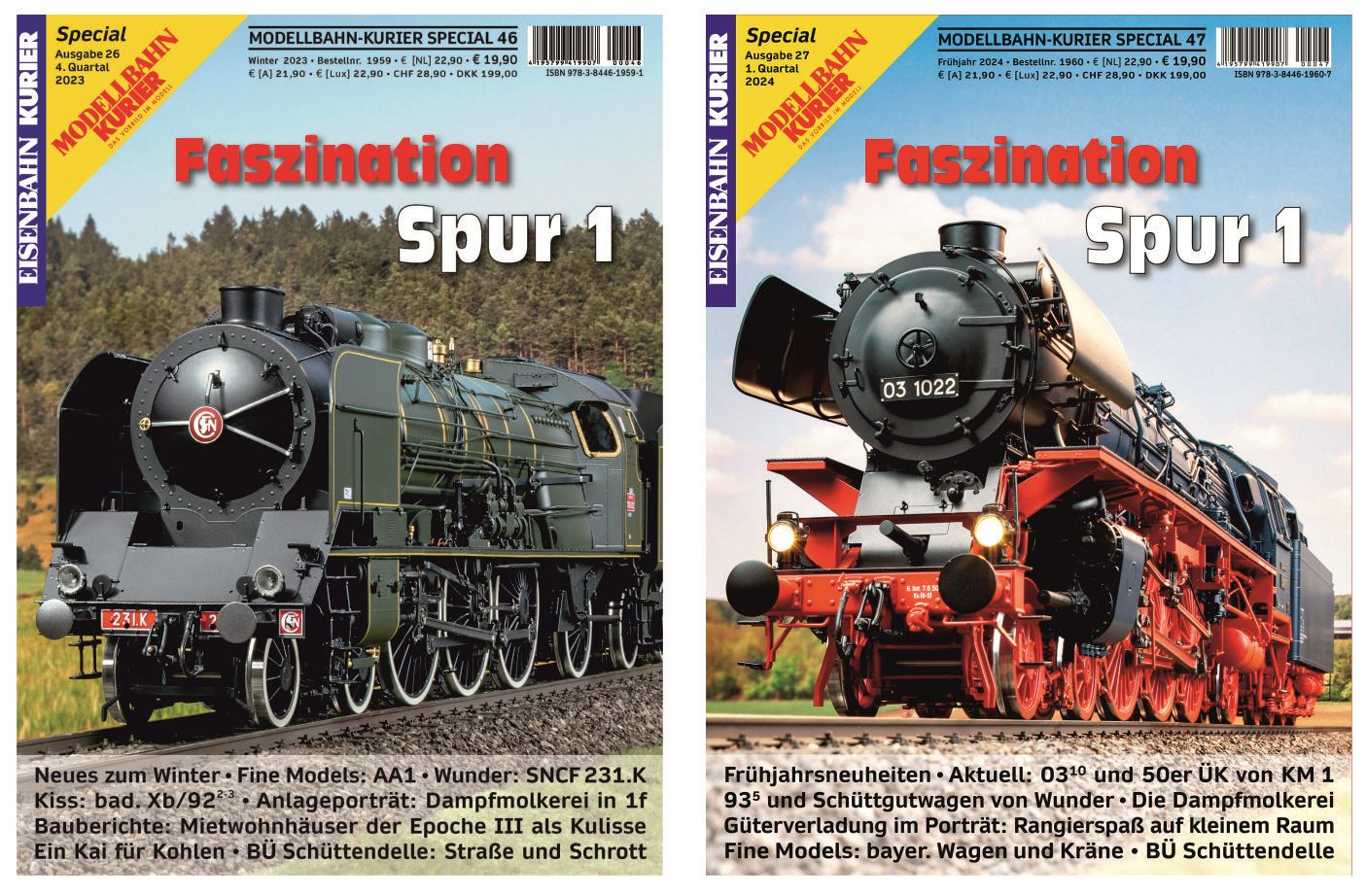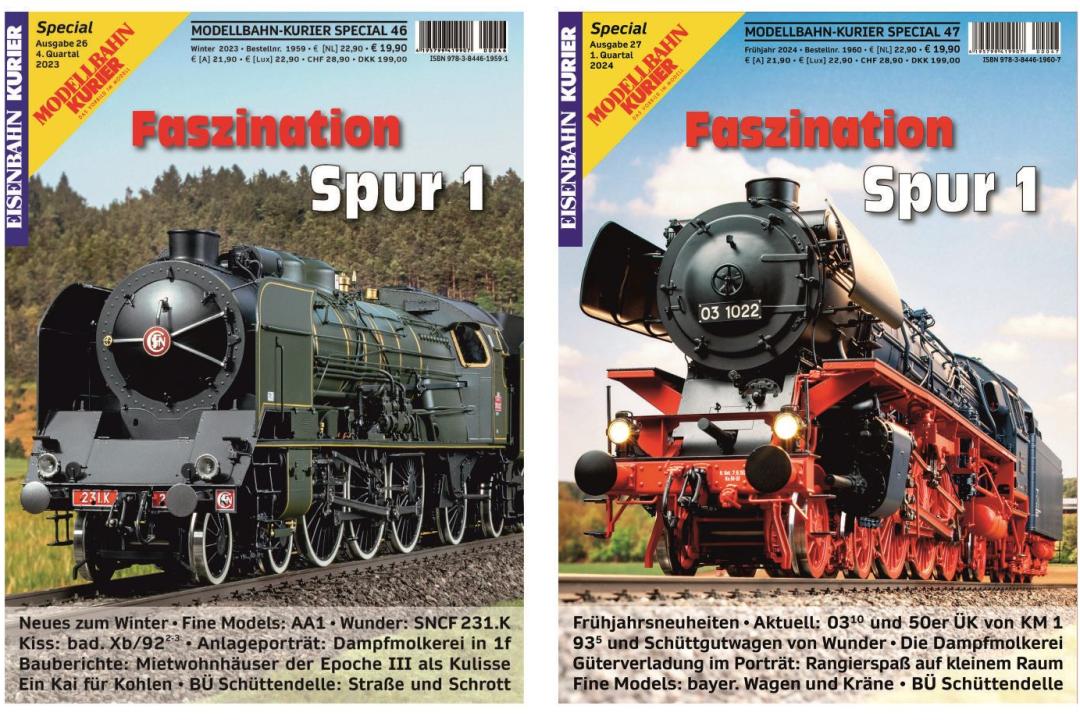 In den Ausgaben vom Modellbahn-Kurier Special #46 und #47 "Faszination Spur 1" gibt es eine ausführliche Vorstellung meiner 1f- Feldbahn-Anlage "Die Dampfmolkerei". In den beiden nebenstehenden Ausgaben gibt es je fünf Seiten, auf denen die kleine Anlage anschaulich in Wort und Bild vorgestellt wird.