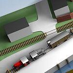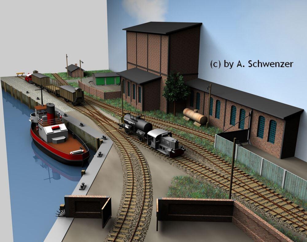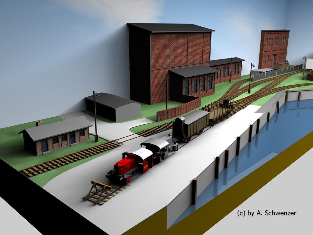 für eine dreidimensionale Zeichnung hatte ich schon recht frühzeitig. Einige Entwürfe waren schon dem gewünschten Aussehen recht nah. Doch so richtig bekommt man erst mit diesen Zeichnungen eine Vorstellung von der Anlage. Bei den Gebäuden sind die Abmessungen nicht zu 100% korrekt, aber der Gesamteindruck ist absolut stimmig. Die Zeichnungen wurde von Andreas Schwenzer aus Halle/Saale erstellt - herzlichen Dank.